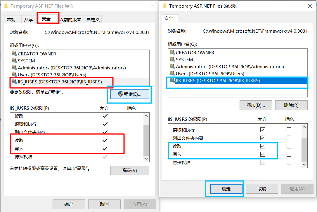 2、右键点击Temporary ASP.NET Files文件夹(不存在则创建),然后点击弹出菜单“属性”,选择属性窗口中的“安全”页,如下图,查看IIS_IUSRS的权限,至少要有读取,写入如果没有,则点击“编辑”,给IIS_IUSRS赋权限。